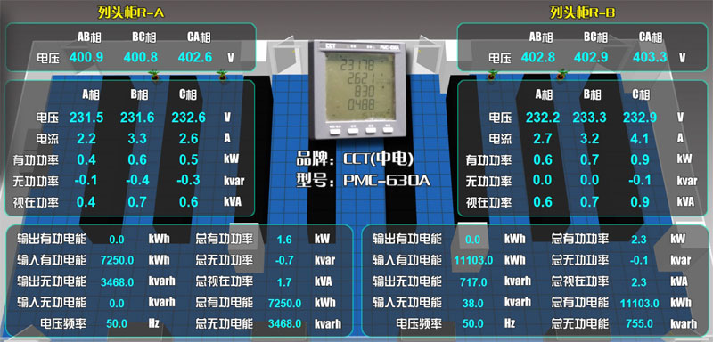 直流电交流电电监控是各种高低压配电进行监控,配电数据采集是通过安装的智能电表或加装电压电流传感器来完成的。通过读取智能电表的数据,实时监视每台配电柜的输入电压、电流,输出电压、电流,电源的频率、总用电能耗等参数。
